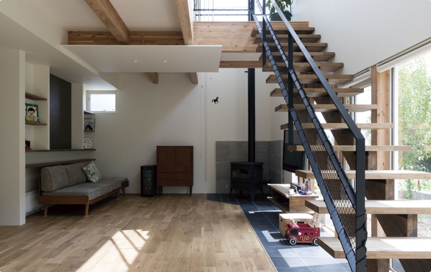 ミライエホームでは風の通り道や季節ごとの日差しの変化、ロケーションを生かした眺望など、その土地ならではの特性や気候風土をしっかりと読み解きます。そしてご家族の暮らしをイメージしながら、窓を増やすのではなく、適所に開口を集約して大きくします。そうすることで空間にはメリハリが生まれ、ご家族の居場所も明るく、そして快適なものになります。